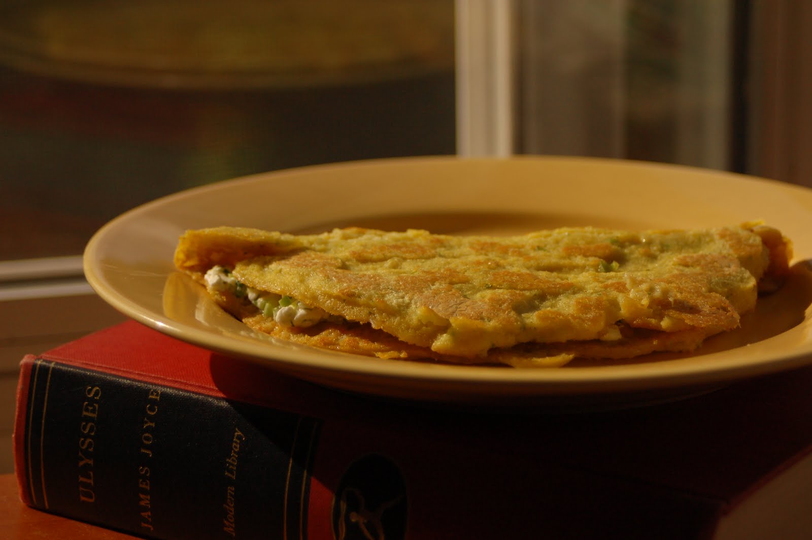 Okay okay, so you made lentils into the shapes of pancakes, you say, but how did they taste? Quite frankly, delicious. This may be my favorite lentil application so far. A nice break from the sweetness of traditional pancakes, especially post-syrup, these savory, crepe-like pancakes have a good flavor from the lentils that is bumped up by the cilantro and chilis. The cottage cheese filling was a little off, although using something similar but, for lack of a better non-Taco-Bellian adjective, melty would be very nice. Next time I’ll go for some queso fresco or paneer. You might even want to try a little something on the top. Say, take two tablespoons of simple syrup and mix into half a cup of sour cream, add a dollop to the top of each pancake and sprinkle on some finely minced chives. Mmmmm, that sounds tasty.
