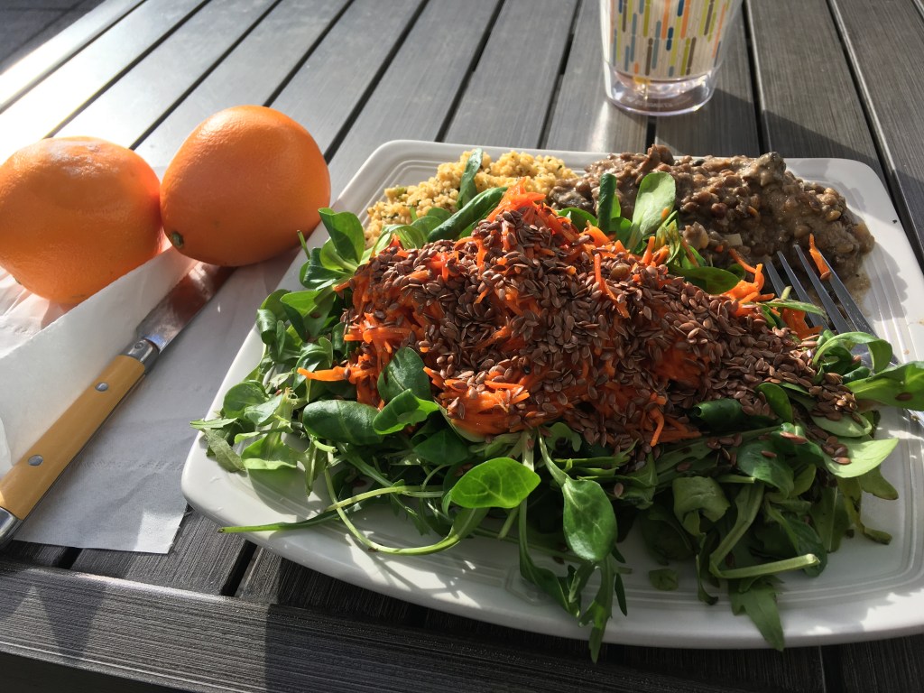 The high end version of intermittent fasting (before getting into actual longterm fasts) is the 20-4 schedule, where you fast for 20 hours each day and eat for 4. So I planned to eat a big salad with lentils or beans for lunch and a small snack later, then just water, coffee, and tea the rest of the day.