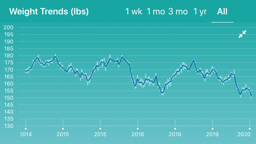 And here is where the ‘slow’ part comes in. My default setting is ‘all or nothing’, and for most of my life, I would want to see how far I could take this. To run in the red until I crash. But then it takes a while to get back into a rhythm again. I’ve measured my weight almost every morning for more than six years and you can see that there have been some swings: