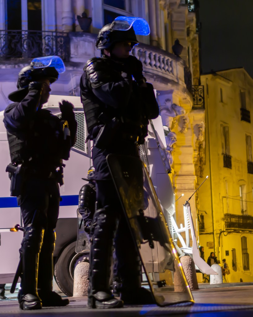 From an experience perspective, I have never before been penned up in a public space and not been allowed to leave. I didn’t feel in danger, per se, but I did keep my camera out longer than I would have in case a clash broke out. More so, if I had just been walking on the street and stopped by to look, but had somewhere to be like a date or even the hospital, that would have been a big problem. (Or if I had eaten something I shouldn’t have for dinner and needed to find a bathroom ASAP.) I’m not sure what the laws are but I feel like that isn’t allowed in the US. I’m sure my lawyer friends could correct me, but my guess is that either you would be allowed to leave the public area or they would need to detain you, but I’ve never heard of a large group completely surrounded on the street and not allowed to leave. Either way it was quite the photographic adventure!