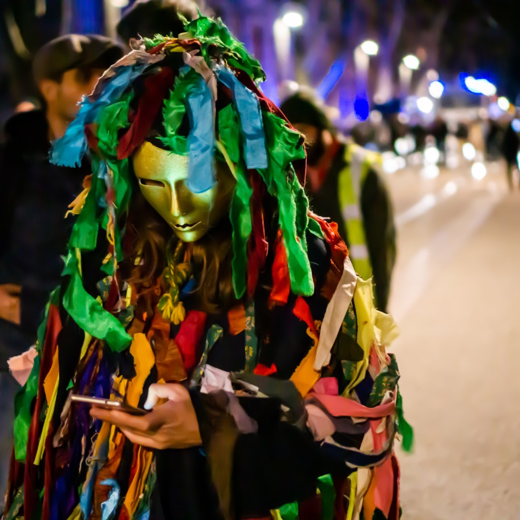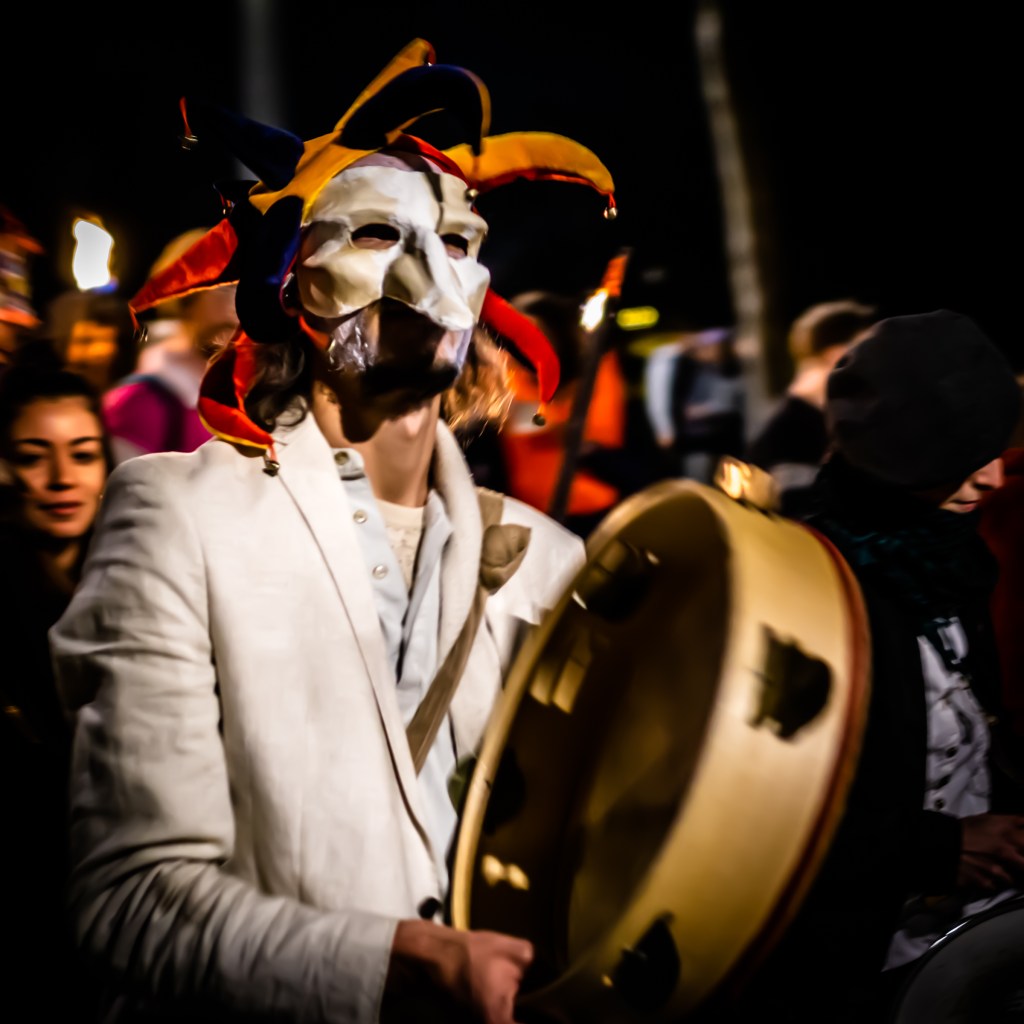So yesterday evening got interesting. After I got home from work I had some quick dinner and then grabbed my gym bag and my camera. The plan had been to take a couple quick pictures around town and then head to the gym. When I was walking toward the Prefecture, I saw a bunch of police and then heard a crowd gathering by the Arc de Triomphe. Confused why the Gilets Jaunes (Yellow Vest movement) would be out on a Tuesday night and excited at the prospect of some cool pics, I went to investigate. Turns out that in fact this Tuesday was Mardi Gras / Carnaval, and a crowd in disguises with torches and drums were marching down the street.