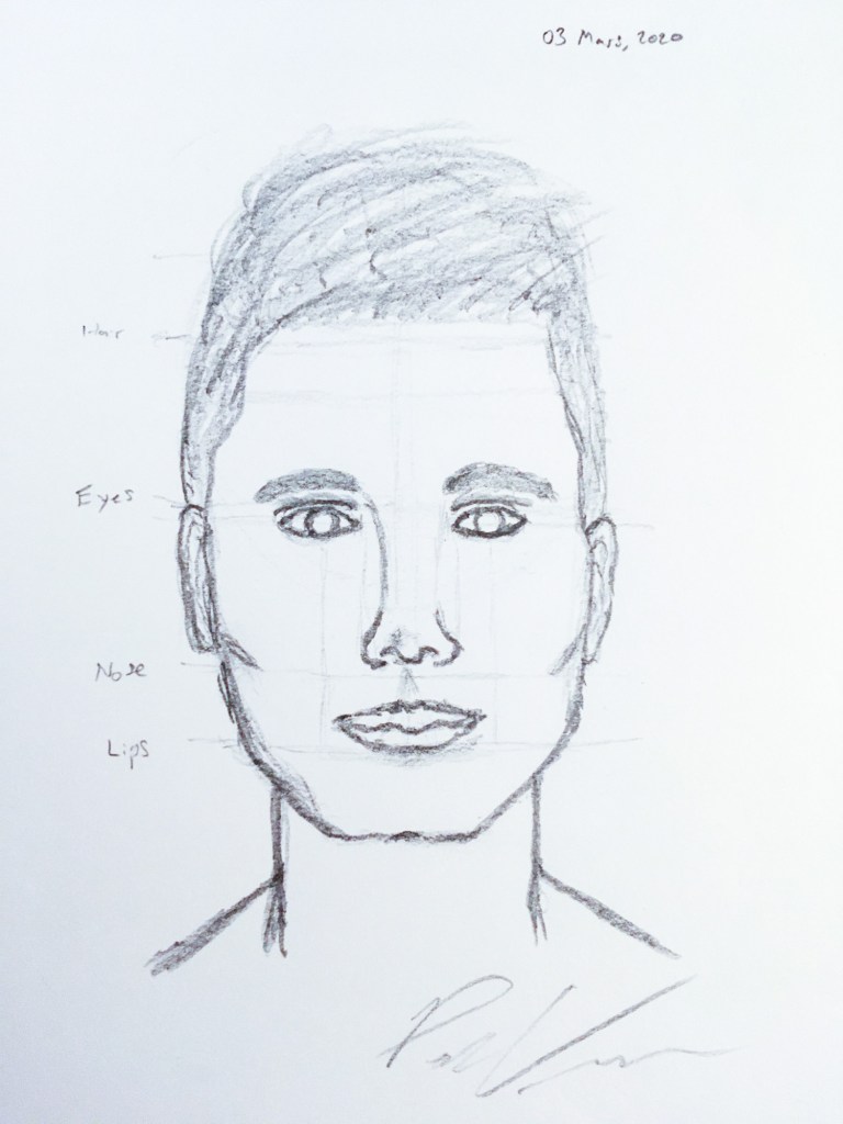 A quick YouTube search yielded a video about how to draw simple head shapes that had been recently uploaded. I had seen similar ‘wire outline’ sketches of figures before, but didn’t know where to start and had thus never attempted them. But it turns out that it is pretty simple. Begin with a circle for the skull, box in the jaw, add curved horizontal and vertical lines on the face, and it already starts to resemble a head.