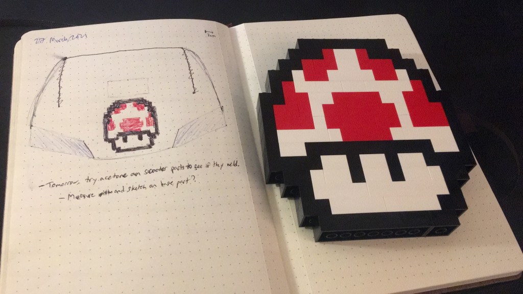 As my Peugeot logo was part of the original front plate that was stolen, I decided to make my own. I drew inspiration from my new fascination with filamentous fungi and the childhood memories of interspersing sessions of Lego construction with Super Mario Brothers. So I went onto the Lego website, and ordered the Legos that I would need to make the iconic 8-bit Amanita muscaria mushroom.