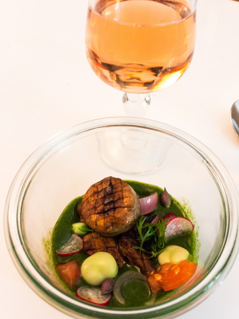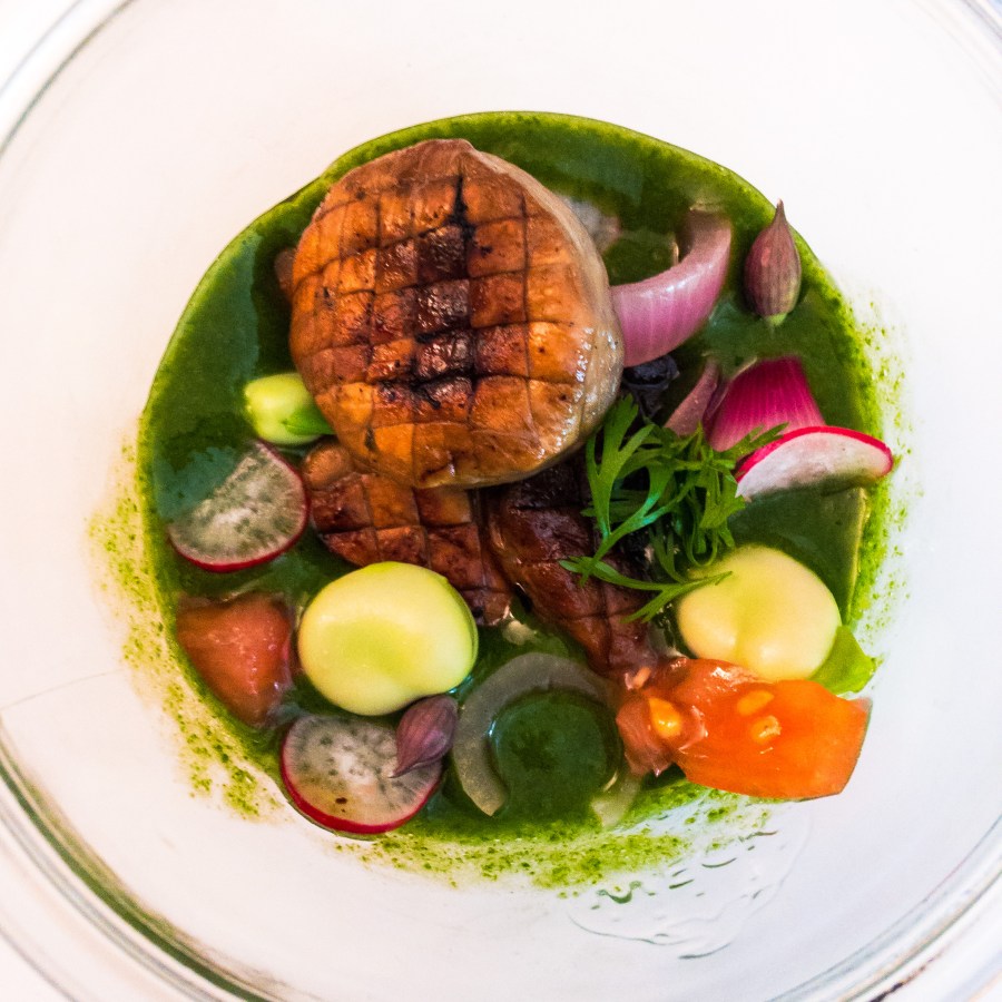 In researching scallop alternatives, mushrooms (particularly king oyster) came up repeatedly. While none of my nearby markets carried king oysters, I did find some large white buttons (champignons de Paris) that I was able to cut into cylinders, marinate in a mixture of kombu, lemongrass, and garlic, and then score and sear. Then, I plated them in a similar style to a ChefSteps dish, with a spinach and radish greens sauce, fava beans, sliced radishes and green peppers, heirloom tomatoes, pickled onions, chive blossoms, and a little cilantro.