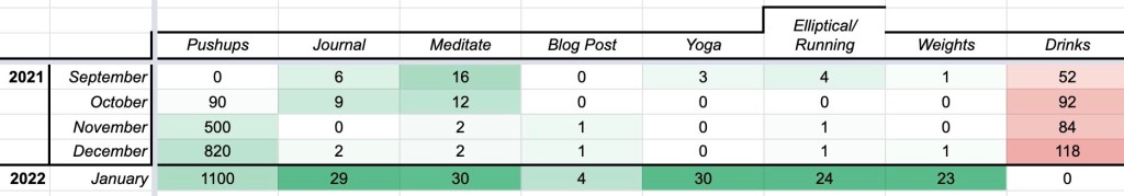 This is the third in a series of two other posts about trying to make some changes in my life as we changed over into 2022. While the first talked about how I think about habits and the second described one of the tools I was using, Dry January, this last one is about some of the progress that I have made.