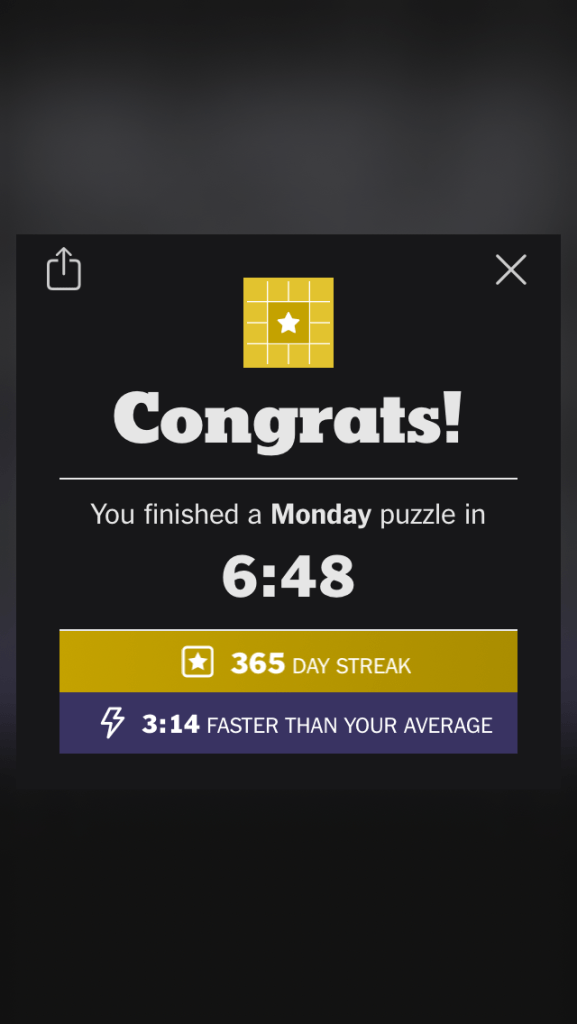 I haven’t always been into crosswords, though. I’ve enjoyed doing the occasional one in the back of an airline magazine when I ran out of things to read, but I’ve never been someone who goes straight for the page in the newspaper…or really been someone who has had paper newspapers as an adult. But about three and a half years ago, I downloaded the New York Times Crossword app and signed up for a subscription.